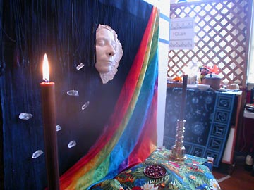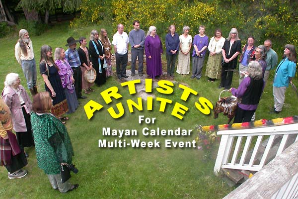 The theme was the the Mayan Cosmology as depicted by the 13 moons in their calendar year and how each artist, born under one of those moon cycles, interpredted the symbols and charateristics particular to moon cycle. Pictured here are just a few of the 'Temples' and their artists. Please go and see more. The Temple of the Feathered Serpent is open until the full moon, June 13, 2003. Dates open and times are in an article previous to this one. This event has been envisioned and coordinated by dwayneedwardrourke.com photos: richardtrueman.com |